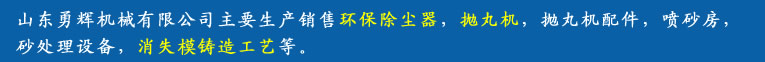 歡迎進入山東勇輝機械有限公司官網!我公司主要產品有環保除塵器,消失模鑄造工藝,拋丸機及配件。!